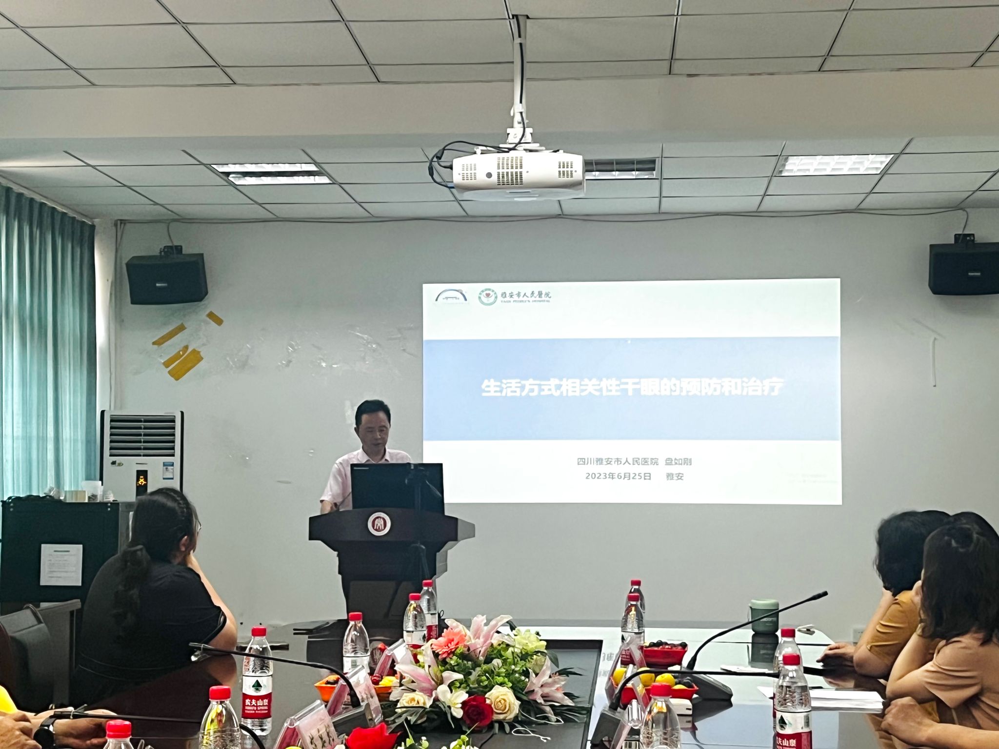 本次活动邀请到雅安市人民医院副经理、眼科专家盘如刚,急诊科主任吴艺,党委委员、院办主任范岳邦以及体检中心主任张凌参与。盘如刚作为主讲人,以“生活方式相关性干眼的预防和治疗”为题作了专题报告。他从“什么是干眼症”、“干眼症有什么症状”、“哪些生活方式会造成干眼症”、“干眼症如何预防和治疗”四个方面进行了全方位的专业介绍。在场教职工针对感兴趣的眼部问题与盘如刚医生进行了交流,盘医生耐心细致地对教职工提出的各种眼部问题进行了答复和指导。