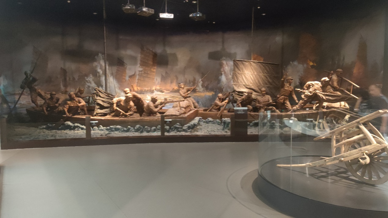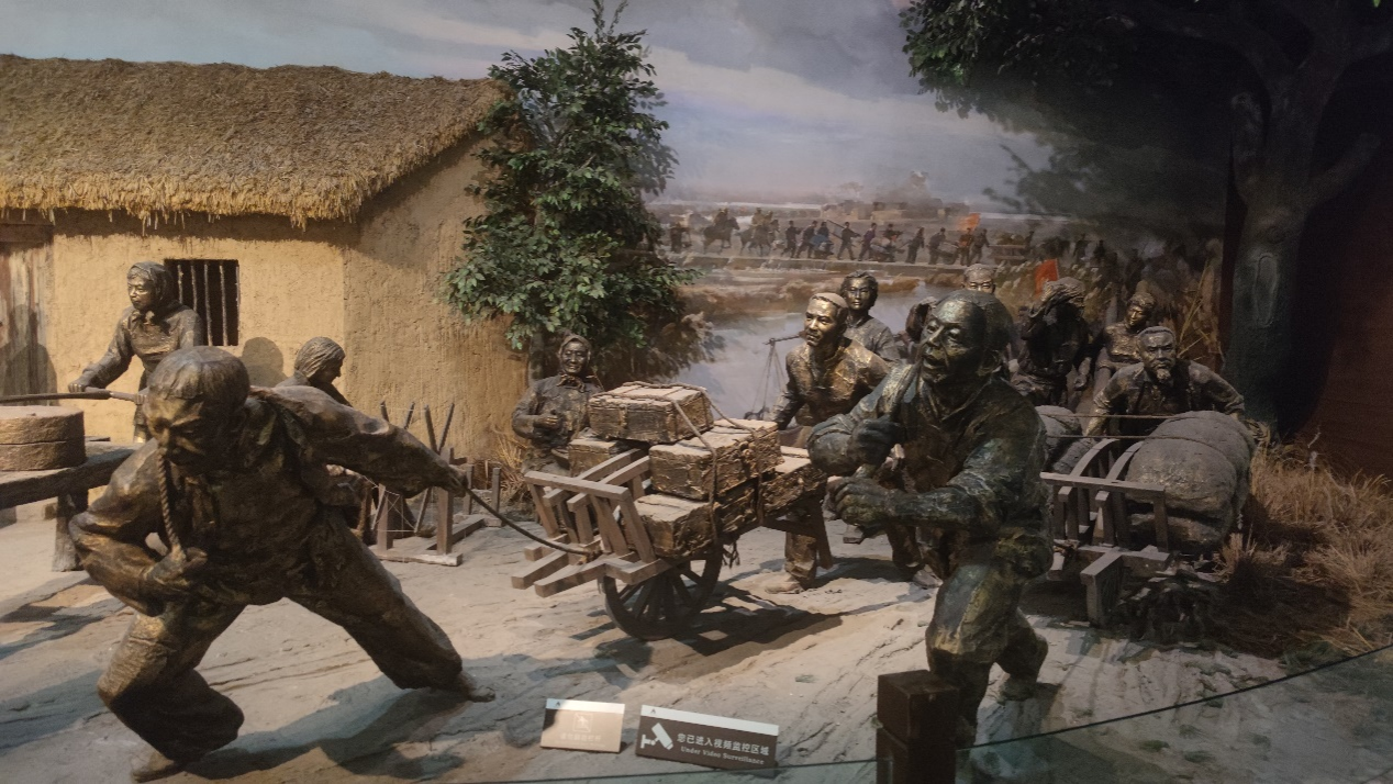在突破江防和人民支前展区中,陈列着数座雕塑,解放军眼神坚毅、村民神情坚定,展现出军民共同作战的团结精神,也让团队成员深刻感受到当年的战争场景、战地情缘和军民之情。