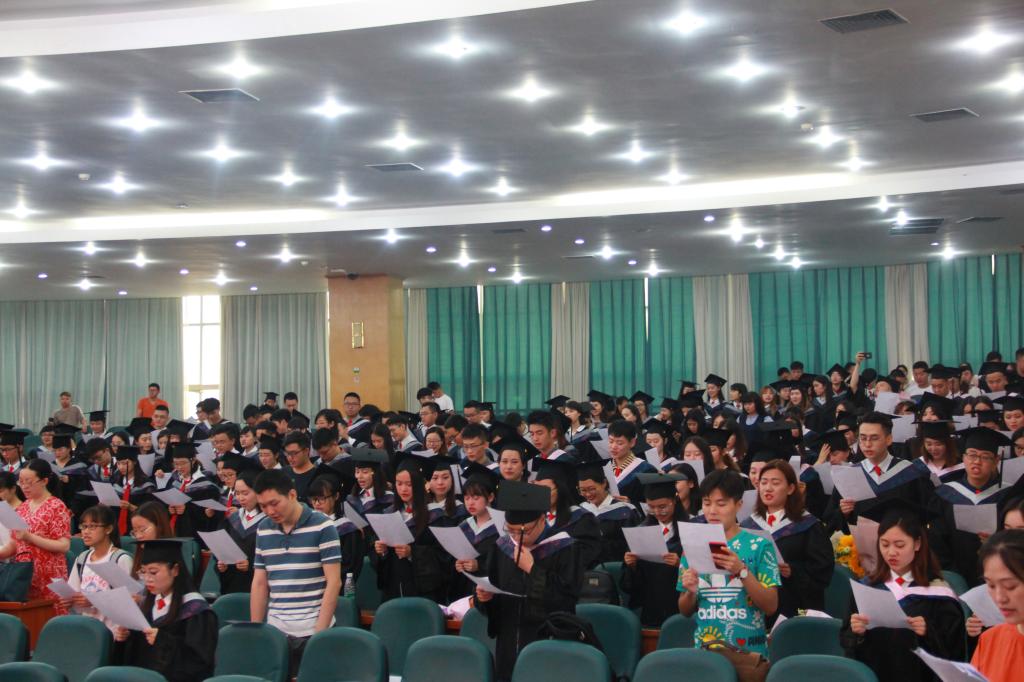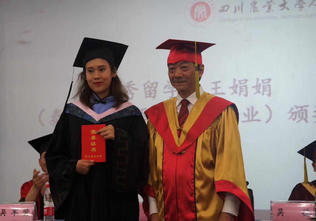 8点半,毕业典礼准时在国歌的奏响中拉开帷幕。新葡的京集团350vip8888经理吴军赞在致辞中首先对所有人文毕业生表示了祝贺。他表示,毕业生在四年中是伴随着社会的发展成长的,“吾生也有涯而知也无涯”,他希望全体毕业生能继续潜心学习,志存高远,百折不挠,秉承着“川农大”精神,用行动成就人生。接下来,由公司党委副书记杨仕元宣读表彰省级、校级优秀大学毕业生和优秀职工的决定,由新葡的京集团350vip8888副经理任大廷宣读表彰优秀毕业论文的决定,来自泰国,就读于汉语言文学专业的王娟娟作为公司第一位优秀职工同其他员工代表上台领奖并合影留恋。