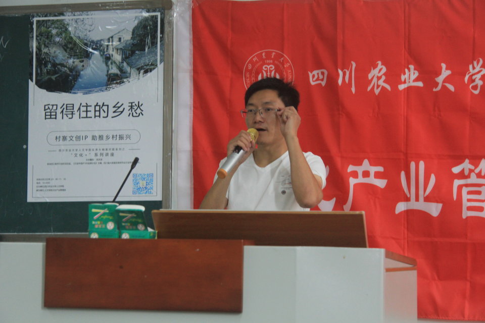 接着主讲人茹洪波针对此次“村寨文创IP,助推乡村振兴”的讲座主题开始了演讲。茹洪波首先对自己的就职单位,中国知名互联网媒体——新浪进行了简单介绍。接着,他又通过现场问答的方式,提出文化价值和产业价值的互相赋能,实现更高效的数字化生产与IP构建的概念,加深了同学们对于文创IP的理解。“很多时候,人们喜欢的不是产品本身,而是产品所处的场景以及场景中自己浸润的情感”,茹洪波着重强调。他以在地文化为中心,从建筑风格、思乡情怀、生态文化、传统礼仪等视角出发,提出要讲村寨的真实故事,讲述“家”的情怀,并举出了贵州、徽州等实例予以说明。最后,茹洪波以自身打造的“乡村会客厅”为案例,对文创IP核心文化设计、新媒体下文创IP的运营进行了讲解。